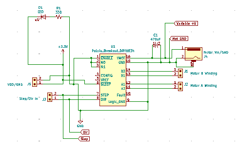 Ultimately the Beaglebone Black can only output STEP and DIR signals and the bipolar stepper motor needs appropriate power levels on it's two coils. Accordingly, a DRV8834 Low-Voltage Stepper Motor Driver Carrier from Pololu was used to provide this conversion. The DRV8834 driver was mounted on an isolation routed single sided PCB board which contained a few other passive components such as quick release terminal block connectors, a LED and a barrel jack for the low voltage, low current DC supply for the stepper motor. The board was designed in KiCad version 8 and the LineGrinder (version 03.07) open source software was used to convert the KiCad Gerber files into GCode in order to isolation route the board.