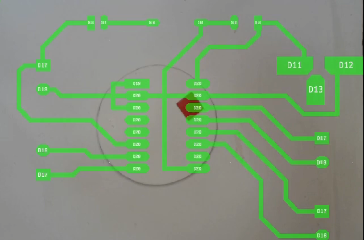 The ability to inject virtual entities into a webcam stream and have the system react to it as if it were real should prove to be useful in the future. For example, in the image at left, a sample circuit has been overlayed on the display. Robot manipulators could use this network of colored paths as a goal or as real world position markers. Objects could be built by moving items onto or around the virtual traces or the traces could be used as paths for movement. Since the virtual entities do not actually exist in the real world they could be dynamically adjusted so as to change the system goals or paths. In addition, semi-transparent traces would change color as objects were moved onto or through it. Since the image recognition system detects color as well as shape, this effect could serve as an automatic real-world marker of the state of the target environment. In other words, a component off of the trace is one color and a component at the same location as the trace is another color as it is being viewed through a semi-transparent colored overlay. For the purposes of object recognition, the automatic color change is indicative of the location state. No record of an objects position would need to be kept - the real world state of the system is the record.