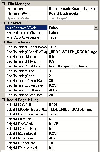 Edge Mill File Managers produce the GCode which cuts around the border of a PCB - thus removing it from a larger blank PCB. Edge Milling GCode is created from the Gerber file contents by associating a File Manager with an OperationMode of type BoardEdgeMill with the file. The association is performed by setting the FileNamePattern field of the File Manager to all or part of the Gerber files name. The Edge Mill File Manager expects the outermost Gerber Plot items in the Gerber file to be the outline of the PCB board. Edge Mill File Managers should only process Gerber files which contain a PCB board outline.