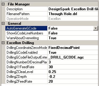 Excellon File Managers produce the GCode which drill the pad holes and vias in the PCB. This automates the task of manually drilling the holes with a drill press and hence reduces the breakage of drill bits (they are very thin). Excellon GCode is created from the Excellon drill file contents by associating a File Manager with an OperationMode of type Excellon with the file. The association is performed by setting the FileNamePattern field of the File Manager to all or part of the Excellon files name.