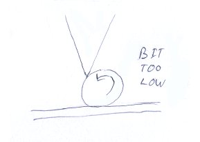 - For added accuracy and consistency, once you can roll the reference height cylinder under the engraving bit, drop the engraving bit back down a tiny amount so the reference height cylinder can no longer be rolled underneath it. Then press firmly down on the reference height cylinder so as to compress things ever-so-slightly. If, while pressing down on the reference height cylinder, you can gently roll the it under the engraving bit and yet cannot do so when gently rolling it with no down force you will have placed the tip of your engraving bit to within a very narrow window of error with respect to the surface of the PCB. The image below shows this as a side view.