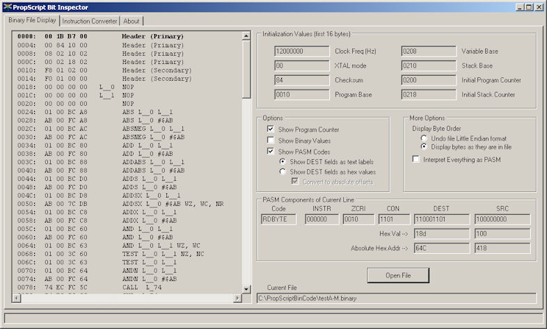 The PropScript Bit Inspector is a tool which can display the contents of .binary and .eeprom files which are intended to be loaded and executed on the Propeller Chip. Among other interpretations and presentation abilities, the software can disassemble the sections of those files which contain PASM binary codes. Note: the PropScript Bit Inspector software cannot interpret Spin byte code and simply annotates bytes representing such code with the word SPIN .