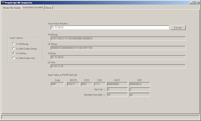 The PropScript Bit Inspector software was developed to assist with the interpretation and validation of the output of the (as yet) unavailable PropScript Compiler. It is released under the the MIT License in the thought that it could be a useful, if somewhat specialized, tool for other low level developers and programers developing software for the Propeller Chip.