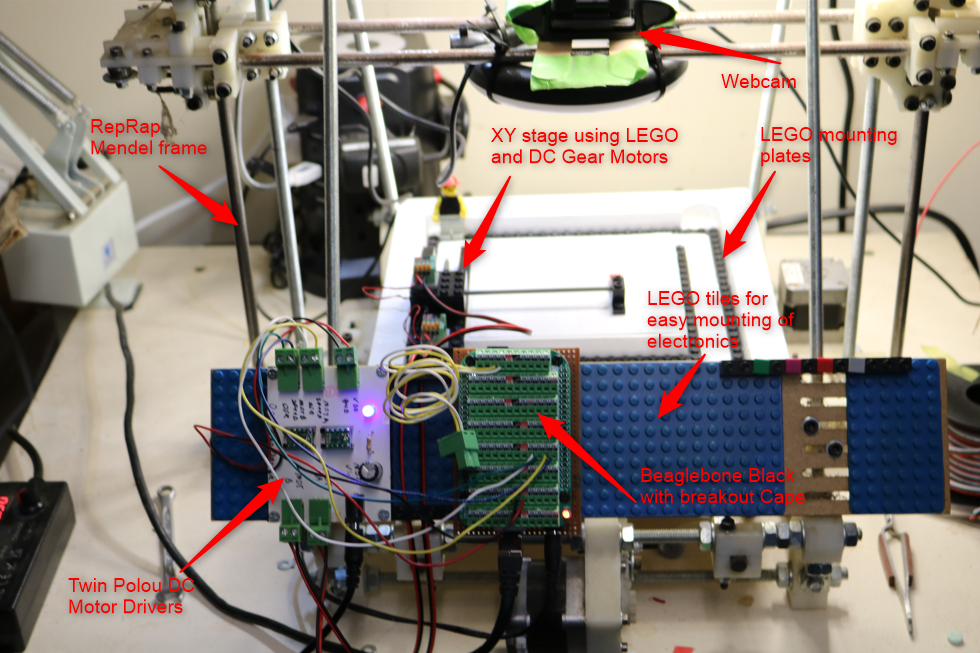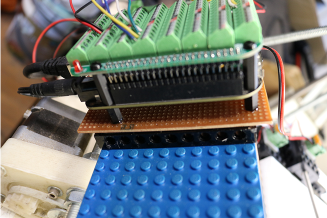 As mentioned in the previous discusson of the Mounting Base Steggo Modules, the FPath project uses an old RepRap Mendel 3D printer as an experimental platform. Such experiments necessitate the implementation of quite a bit of custom electronics and, of course, the associated rats nest of wiring running about. There is nothing more frustrating than spending an hour diagnosing a problem only to find out it was entirely due to a wire which had worked loose because the electronics were just rattling about in an unsecured way. Yet, since the experimental apparatus is always in considerable flux, you do not want to screw or glue everything down permanently. The solution is to use LEGO to mount the electronics!