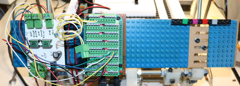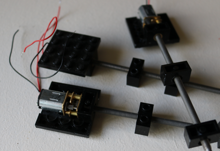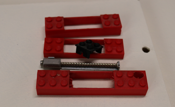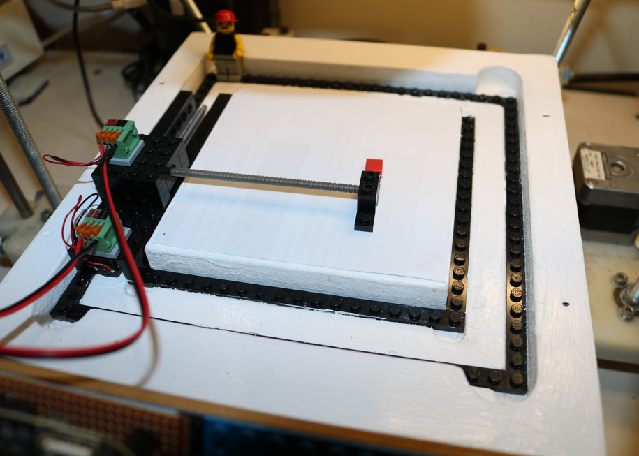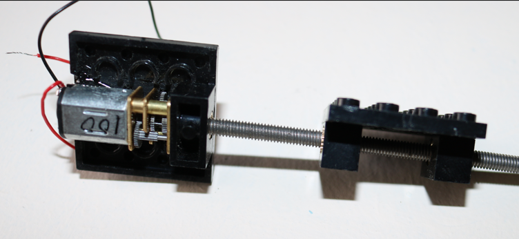 This is the original Steggo module and it is not finished. As you can see in the image, a couple of "Brick 2 x 10 : Part 3006" parts have been hollowed out and a salvaged stepper motor and lead screw has been positioned beside them. The idea is that the stepper motor and shaft are fully hidden inside the LEGO brick and a carefully machined "Brick 2 x 2 : Part 3003" is intended to be used as a carriage attached to the lead screw. You can see this black 2x2 brick in the image - it fits exactly in the channel machined out of the red LEGO blocks.