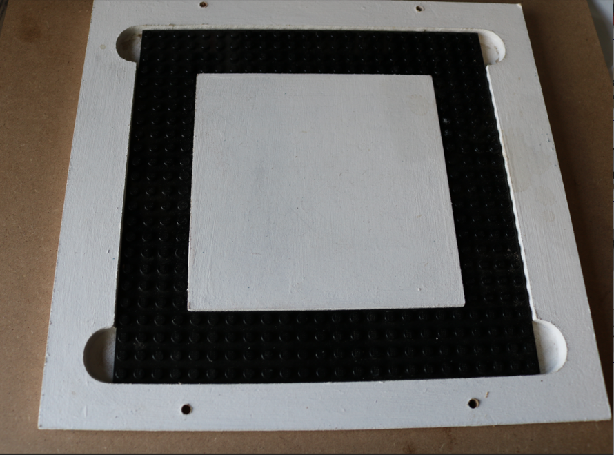 The second image shows the Shallow Mounting Base. This is designed to mount Steggo modules slightly lower than the bed height in order to bring their active edges level with the top of the experimental area. The routed out depth of the recess is one LEGO unit. In other words, placing a standard LEGO plate underneath any Steggo Module will bring its bottom edge level with the experimental bed. Black LEGO plates surround the experimental bed and are permanently epoxied in place.