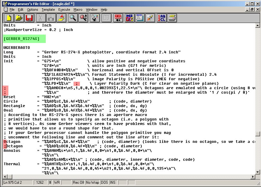 The image below shows the eagle.def file after the adjustments have been made. Note carefully the placement of the semi-colons - the appropriate areas have been highlighted in red.
