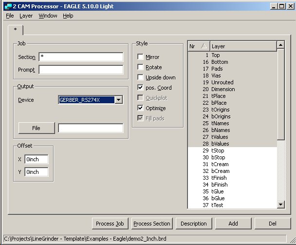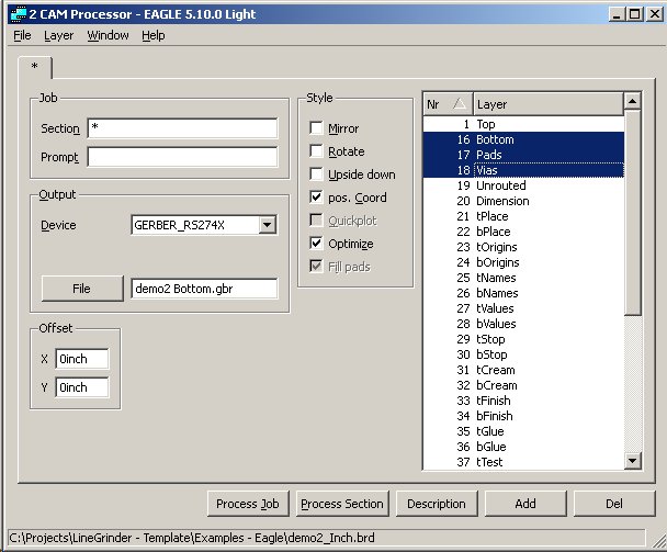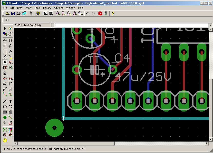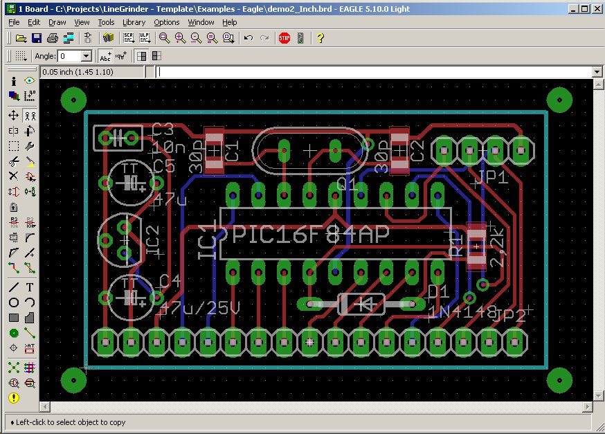 The following is a step-by-step tutorial using the demo2_inch.brd Eagle PCB design sample which is installed with the Line Grinder software in the Examples - Eagle sub folder. Click on any of the images to make them larger.