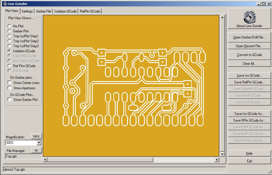 The image below shows the demo2 Top.gbr file after conversion to Isolation GCode in the Line Grinder software.